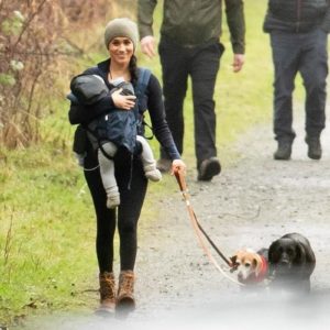 Uno de sus looks más recientes, fue este. En el que la conocida Duquesa de Sussex optó por relajados leggings negros, chamarra térmica, gorro tonalidad terrosa y botas estilo alquimista… sin olvidar su cabello trenzado, dando un paseo con su hijo Archie y su perro, como una mujer común y corriente.