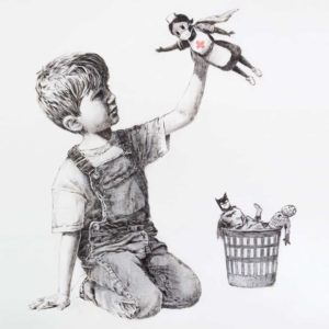 En su cuenta oficial de Instagram, Banksy publicó una nueva obra donde se puede ver a un niño jugando con una enfermera que enfrente tiene una cruz roja, y detrás de se puede ver una capa. El cuadro también presenta un canasto con otros juguetes, específicamente algunos superhéroes como Batman y Spider Man.