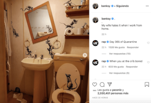 También lo que nos hace sospechar que Banksy se mantiene en aislamiento (todo es misterio con él) es que junto a su nueva creación coloca la siguiente frase un tanto irónica y graciosa: “Mi esposa odia cuando trabajo desde casa”.