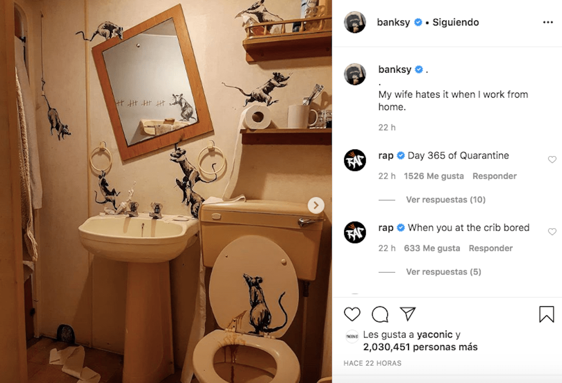 Sí, incluso este polémico artista, que suele sorprendernos con sus creaciones en las calles, ha decidido quedarse en su hogar y respetar los lineamientos. O eso queremos suponer, ya que a través de su cuenta oficial de Instagram, dio a conocer una nueva y original obra en la que podemos observar a un grupo de ratas haciendo destrozos en un baño.