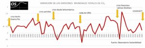 Este primer gráfico elaborado por el Observatorio de la Sostenibilidad muestra cómo descendieron las emisiones globales de CO2 después de las cuatro grandes crisis mundiales de las últimas décadas en las que, fundamentalmente, se paralizo la industria. El gráfico recoge datos de la crisis del petróleo; crisis de la deuda latinoamericana; caída de la URSS y la crisis financiera de Lehman Brotheres. En todas ellas hubo un descenso de emisiones que, inmediatamente, volvieron a subir en cuanto se recuperó la industria y la producción. Lo esperable, según el Observatorio de la Sostenibilidad, es que con el aislamiento por el coronavirus ocurra lo mismo.