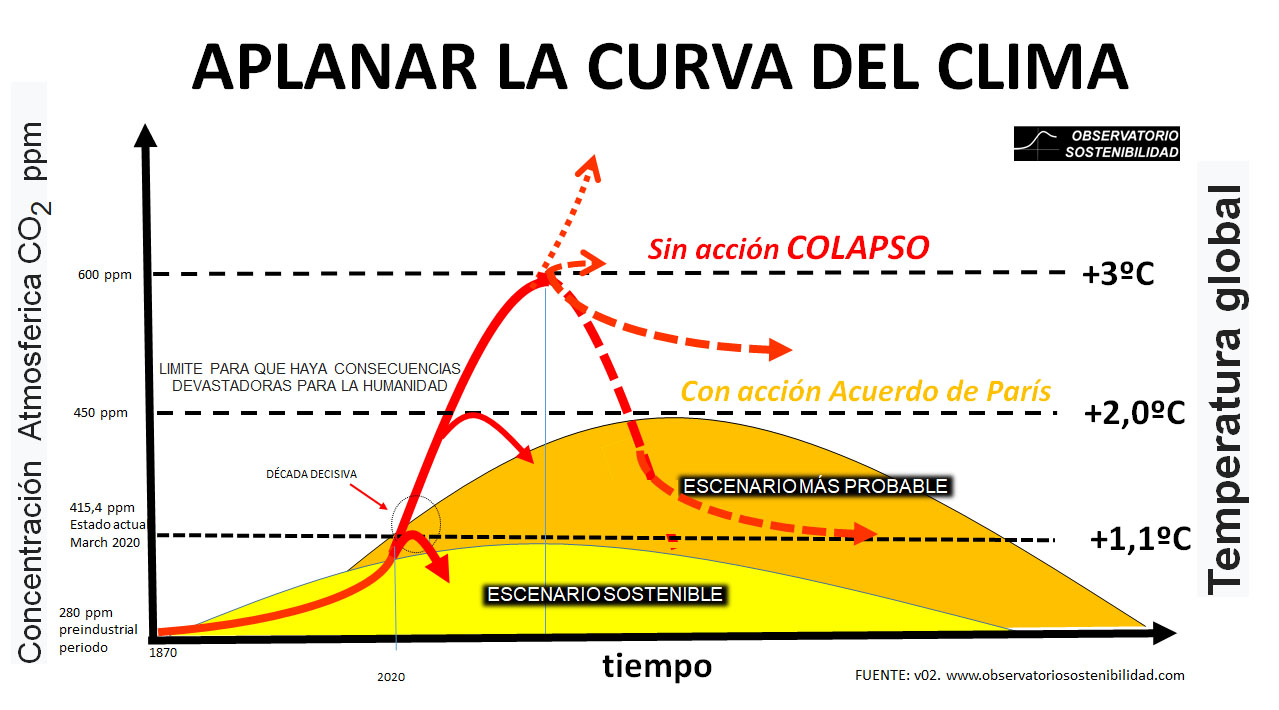 En el Observatorio de la Sostenibilidad, explican que todavía no hay datos de los efectos finales en emisiones de gases de efecto invernadero que tendrá esta crisis, ya que todavía debe extenderse por EEUU, por Latinoamérica, el resto de Europa y no está claro que no vuelva a haber nuevos focos en la propia China. Lo importante dependerá de las semanas o meses que esté parada la industria, el transporte y la economía pero también del tipo de recuperación que se produzca una vez pasados los efectos más graves de la pandemia. Las anteriores crisis económicas no han tenido efectos significativos en la tendencia al alza de las emisiones. Así que una crisis puntual, aunque tenga las dramáticas consecuencias económicas de la actual del COVID19 no es previsible que tenga efectos significativos sobre el clima. Lo importante, como muestra este gráfico para Aplanar la curva del clima, es que vivimos un momento clave para, a partir de aquí, hacer las cosas de otro modo.
