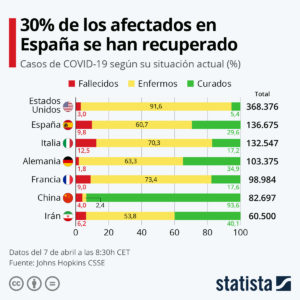 Desde el mes de abril ha comenzado a reducirse el número de contagios y de muertes diarias por la enfermedad del coronavirus en España. Tal y como muestra este gráfico de Statista, un 29,6% de las personas registradas como enfermas del virus SARS-CoV-2, casi 40.500 en total, un 30% de los casos notificados, ya se consideran curadas a fecha del 7 de abril a las 8:30h. Y la curva, sutilmente se aplana.