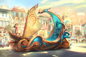 2) En su viaje a bordo de su canoa, Moana se aventura hacia la cresta de una ola imponente, inspirada en los preciosos grabados de madera “koa”, insertando deslumbrantes destellos animados en la magia que contiene el océano. Esta es la primera carroza a gran escala inspirada en “Moana” que se ha creado para un parque Disney.