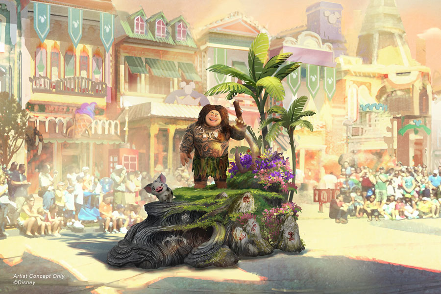 3) A Moana la acompaña Maui, quien viaja en su propio pedazo mágico isleño con el adorable cerdo mascota de Moana, Pua. Moana hace así su debut oficial en Disneyland Resort con “Magic Happens”.