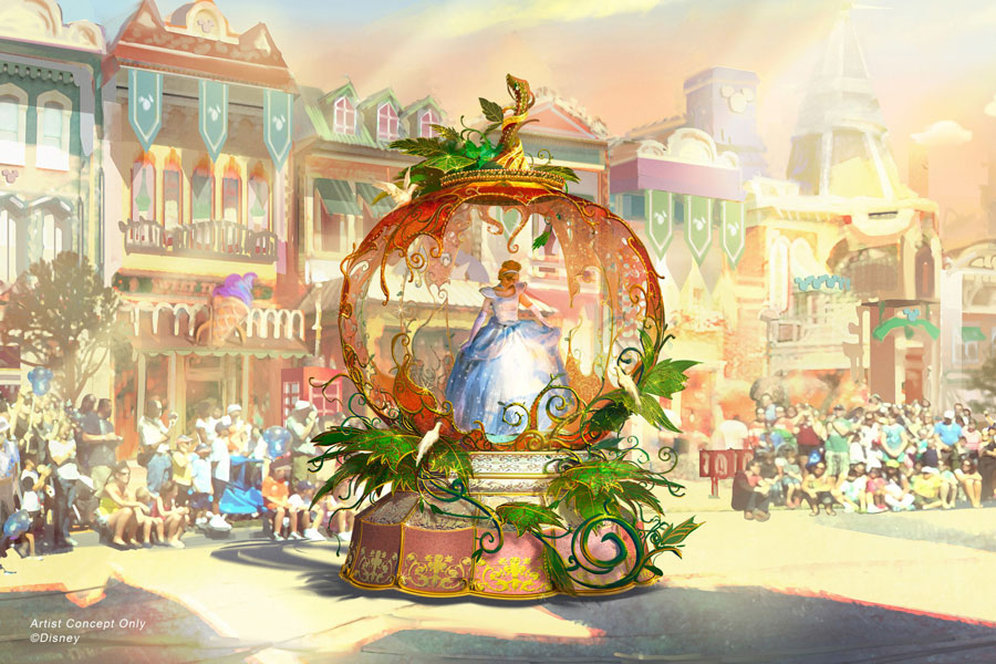 – De “Cinderella” los visitantes son testigos del momento “Bibbidi Bobbidi Boo”, cuando la Cenicienta es vista dentro de su calabaza, mientras la magia transforma su alrededor en un carro reluciente cuando va camino del baile.