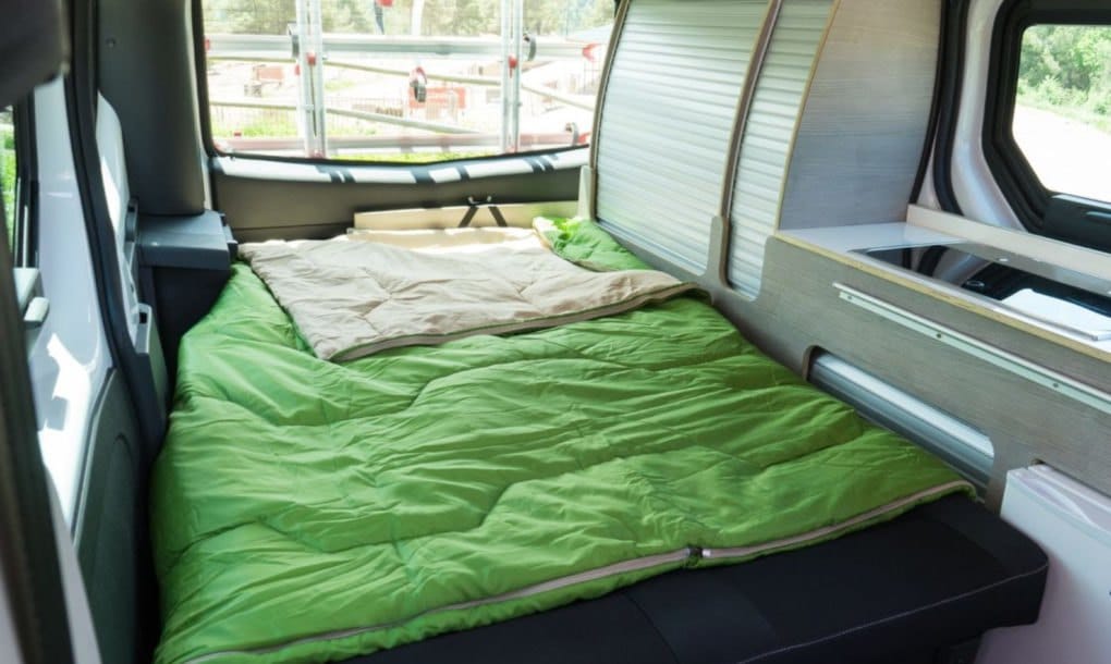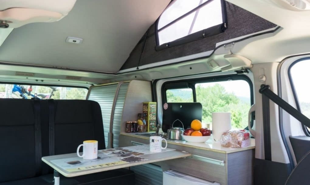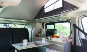 El techo elevable pop-up de la NV300 permite que hasta cuatro personas duerman cómodamente en la furgoneta, dos en la cama inferior y dos en la superior. En ambos modelos, el espacio vital está eficientemente diseñado con una cocina compacta que viene con un hornillo eléctrico, fregadero y frigorífico. Las muchas ventanas permiten que la luz natural inunde el interior, pero las furgonetas están equipadas con persianas retráctiles para mayor privacidad.