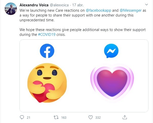 “Sabemos que este es un momento incierto, y queríamos que las personas pudieran mostrar su apoyo, de manera que sus amigos y familiares sepan que están pensando en ellos. Las nuevas reacciones de atención en Facebook y Messenger, son una forma para que las personas compartan su apoyo entre ellas durante este tiempo sin precedentes”, escribió Voica en su cuenta de Twitter.