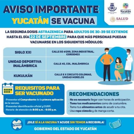 Se amplía un día más la aplicación de segundas dosis a personas de 30 a 39 años en Mérida -Mañana miércoles 22 se realizará la aplicación de la vacuna solamente en los Macrocentros ubicados en Centro de Convenciones “Siglo XXI” y el Multigimnasio “Socorro Cerón” de la Unidad Deportiva “Kukulcán” y en el módulo de vacunación de la Unidad Deportiva “Inalámbrica”. Mérida, Yucatán, 21 de septiembre de 2021.- La aplicación de la segunda dosis de la vacuna contra el Coronavirus a las personas de entre 30 y 39 años en Mérida se amplía hasta mañana miércoles 22 de septiembre, proceso …