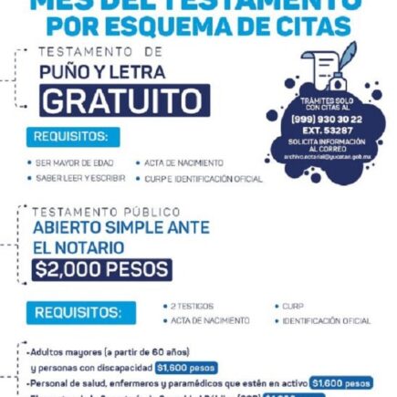 La campaña se extenderá en los meses de septiembre y octubre Mérida, Yucatán, 31 de agosto de 2023.- Como parte de las acciones que impulsa el Gobernador Mauricio Vila Dosal para brindar seguridad y certeza legal al patrimonio de las familias yucatecas, el Gobierno del Estado anunció la campaña “Mes del Testamento” que consiste en condonaciones y descuentos de hasta el 100% en trámites testamentarios durante los meses de septiembre y octubre. De esta manera, tramitar un testamento ológrafo, conocido popularmente como testamento de puño y letra, será completamente gratuito, mientras que en el caso del testamento ante Notario Público …