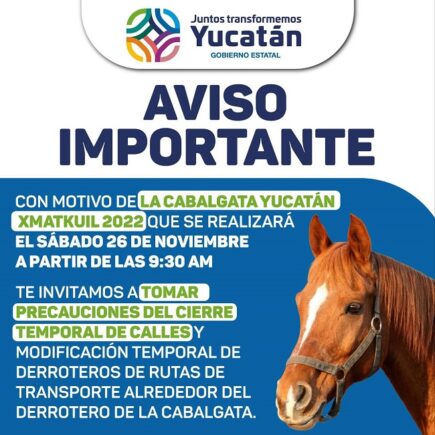 Gobierno del Estado invita a tomar precauciones por Cabalgata Yucatán Xmatkuil Mérida, Yucatán, 25 de noviembre de 2022.- El Gobierno del Estado, con motivo de la Cabalgata Yucatán Xmatkuil 2022, informa que mañana sábado algunas vialidades se cerrarán temporalmente a la circulación, principalmente en el oriente y sur de Mérida, por lo que algunas rutas de transporte que circulan en esas zonas modificarán sus derroteros, sin que ello signifique mayores afectaciones a los usuarios. El evento dará inicio a las 9:30 horas, por lo que el operativo comenzará en el Circuito Colonias, frente al estadio Kukulcán-Álamo, en sentido poniente, hasta …