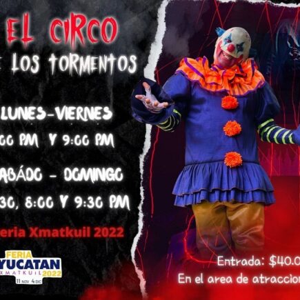 ¿Estás listo para la mejor experiencia terrorífica? Llega a la Feria Xmatkuil, Yucatán, EL CIRCO DE LOS TORMENTOS! Del 11 de noviembre al 4 de diciembre , ven a vivir esta experiencia terrorífica y demuestra tu valentía! ⚡️ ENTRADA: $40 pesos Horario de: LUNES A VIERNES 7:00 pm y 9:00pm SÁBADO Y DOMINGO 6:30 , 8:00 y 9:30 pm ¡Te esperamos! 🕷️🎪Nos encontramos en el aérea de atracciones