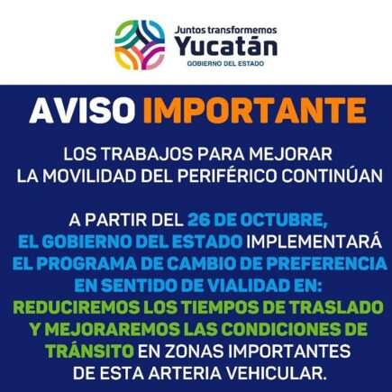 Mañana comenzarán los cambios de vialidad en el Periférico de Mérida, en sus intersecciones con las calles 50 Sur, 42 Sur y 58 Mulchechén Se exhorta a la ciudadanía tomar sus previsiones para evitar afectaciones Mérida, Yucatán, 25 de octubre de 2022.- A partir de mañana miércoles entran en vigor los cambios de vialidad en el Periférico de Mérida, en sus intersecciones con las calles 50 Sur, 42 Sur y 58 Mulchechén, con lo que se contribuirá a reducir los tiempos de traslado para el transporte y agilizar el tránsito vehicular en esa importante vía de la capital yucateca. Ante …