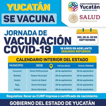 Del lunes 26 al viernes 30 de septiembre, iniciará aplicación de segundas dosis contra el Coronavirus, para niñas y niños de 5 a 11 años, en 14 municipios de Yucatán En el mismo periodo, se distribuirán refuerzos entre personas con edades de 18 en adelante, cuyos esquemas de vacunación estén incompletos. Mérida, Yucatán, 22 de septiembre de 2022.- Del lunes 26 al viernes 30 del presente, niñas y niños de 5 a 11 años, en 14 municipios, empezarán a recibir sus segundas dosis contra el Coronavirus, y se aplicarán refuerzos a personas con edades de 18 en adelante, cuyos esquemas …