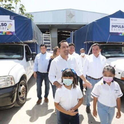 -Este importante apoyo de útiles escolares y uniformes, representa un ahorro de 2,850 pesos por cada estudiante para las familias yucatecas. – Además, con la elaboración de camisas, zapatos y mochilas, se impulsa la economía de más de 2 mil artesanos de 90 talleres de 13 municipios del interior del estado. Mérida, Yucatán, 17 de agosto de 2022.- Acompañado de las alumnas de cuarto grado de primaria, Victoria Valentina Romero Rivero y de sexto grado, Milca Valentina Valdez Gallegos, el Gobernador Mauricio Vila Dosal dio el banderazo de salida de las primeras 6 unidades cargadas con los paquetes escolares que …