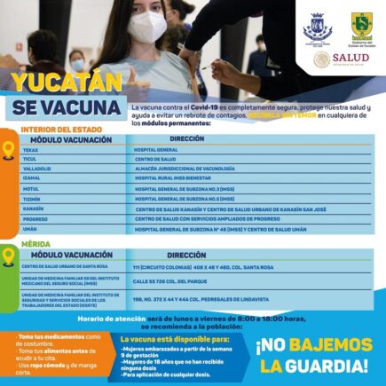 Mérida, Yucatán, 8 de abril del 2022.- Para garantizar la protección contra el Coronavirus a la población yucateca, a partir del próximo lunes 11 de abril, funcionarán nuevas unidades de módulos permanentes de vacunación contra este virus en los municipios de Umán, Kanasín y Progreso, donde los habitantes podrán acudir para recibir la dosis que requieran, proceso que el Gobierno del Estado realizará en coordinación con la Secretaría del Bienestar. La Secretaría de Salud del estado (SSY), informó que, en Umán, se instalarán dos sedes en el Centro de Salud y en el Instituto Mexicano del Seguro Social (IMSS) de …