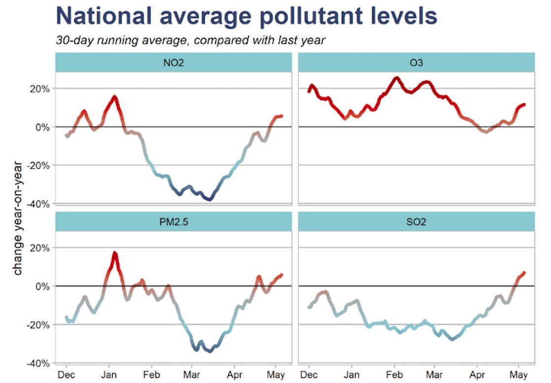 Qué cosas. Con estos datos podemos darnos cuenta de nuestra incidencia —mediante las actividades industriales— sobre el medio ambiente, pues se muestra que el repunte de la contaminación atmosférica sucedió en abril.