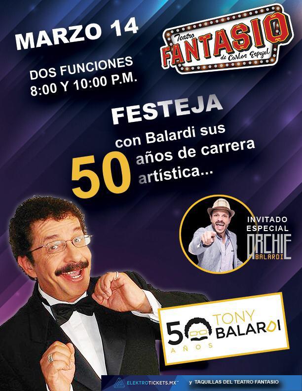 Tony Balardi festeja en la Ciudad de Mérida sus 50 años de carrera artística en compañía de su hijo Archie Balardi. Será una noche de risas para todas las generaciones. Los mejores chistes, el mejor Stand Up y las grandes ocurrencias de la Familia Balardi que los han hecho brillar en programas de televisión producidos por Televisa (Telehit), Univisión (Sábado Gigante) y Comedy Central. Yucatán siempre en el corazón de Tony Balardi, ven y festeja con él este 14 de Marzo en el Teatro Fantasio.