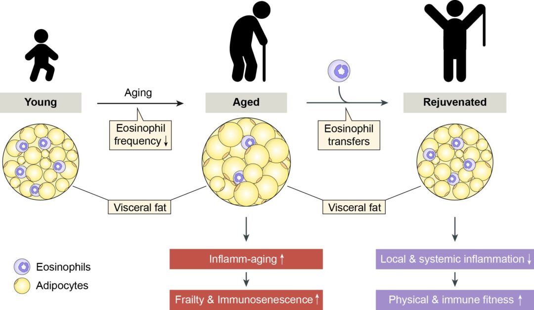Estas células proporciona protección contra la infección por parásitos y promueve la enfermedad alérgica de las vías respiratorias. Con el envejecimiento, la frecuencia de eosinófilos en la grasa abdominal disminuye, mientras que aumenta el número de macrófagos proinflamatorios. Debido a este desequilibrio de las células inmunes, la grasa abdominal se convierte en una fuente de mediadores proinflamatorios que se acumulan sistémicamente en la vejez.