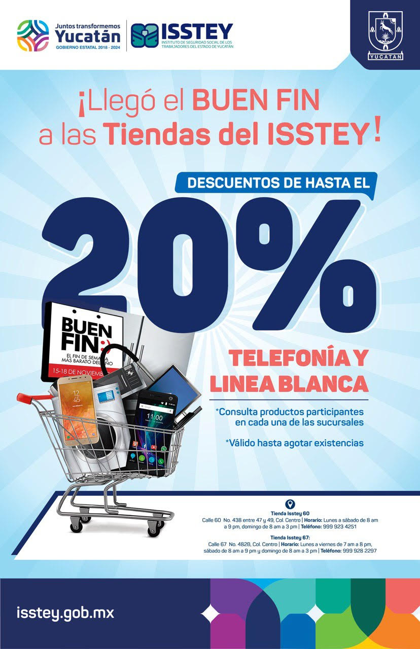 El Instituto de Seguridad Social de los Trabajadores del Estado (Isstey), a través de su titular, María Isabel Rodríguez Heredia, informó que los centros comerciales del Isstey, ubicados en la calle 60 número 438 por 47 y 49, y 67 número 482B, ambos en el Centro Histórico de Mérida, ofrecerán a derechohabientes y público en general un 20 por ciento de descuento en los departamentos de telefonía y línea blanca.