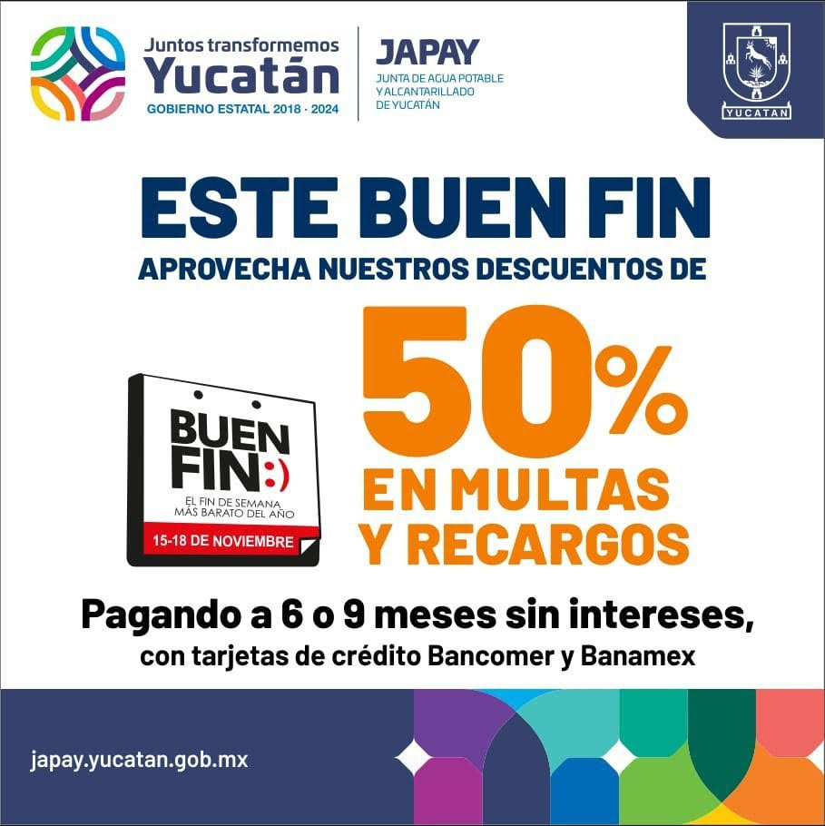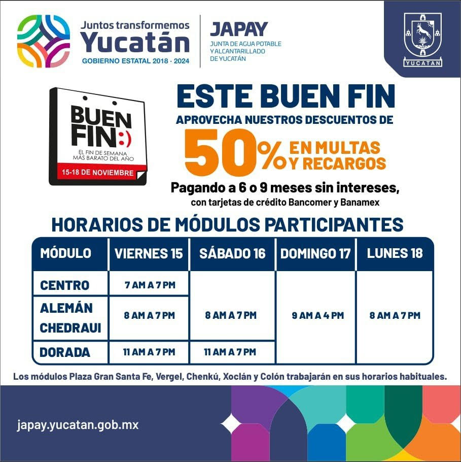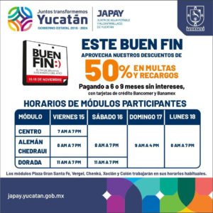 Por su parte, la Junta de Agua Potable y Alcantarillado de Yucatán (Japay) participará otorgando una rebaja del 50 por ciento en multas y recargos, así como plazos de seis a nueve meses sin intereses a quienes paguen con tarjetas de crédito Bancomer y Banamex en los módulos participantes.